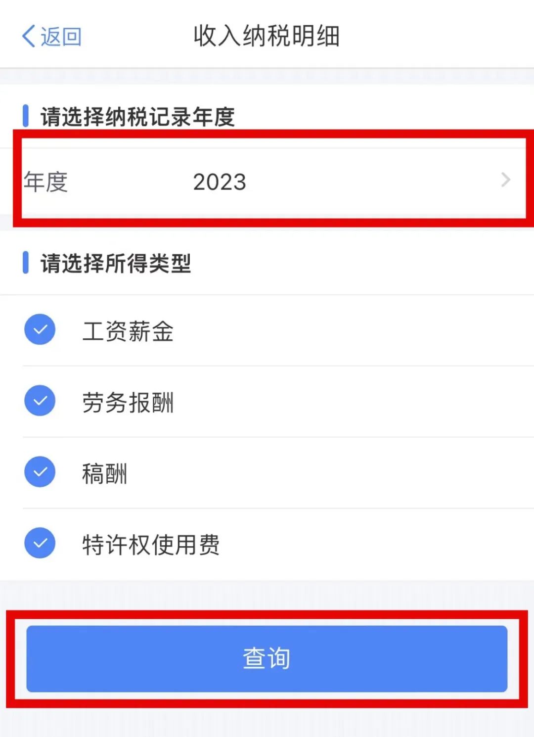 在“汇算准备”页面点击【收入信息】,在“年度”栏选择【2023】,系统默认全部勾选“工资薪金”“劳务报酬”“稿酬”“特许权使用费”,点击【查询】,即可查看2023年度全年的收入纳税明细。没问题可以直接点击【返回】。