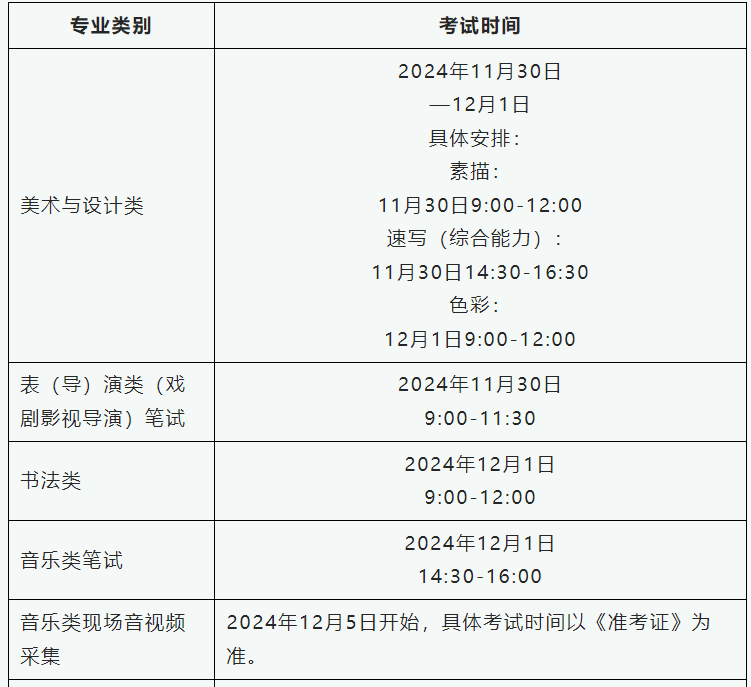 (2)艺术类专业省级统考笔试科目安排在2024年11月30日—12月1日进行,现场音视频采集科目于2024年12月5日开始。