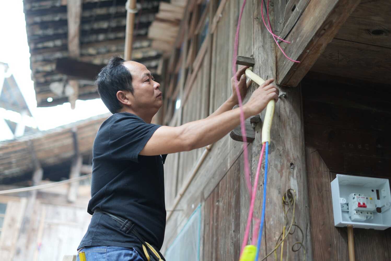 榕江县朗洞镇朗洞社区,电工技术人员对木质连片集中村寨进行“电改”作业。