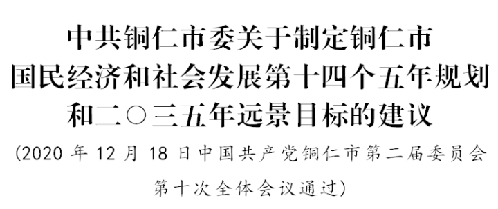 “十四五”时期是我国全面建成小康社会、实现第一个百年奋斗目标之后,乘势而上开启全面建设社会主义现代化新征程、向第二个百年奋斗目标进军的第一个五年。中共铜仁市委认真学习贯彻党的十九届五中全会精神和省委十二届八次全会精神,结合铜仁实际,就制定国民经济和社会发展“十四五”规划和二〇三五年远景目标提出以下建议。