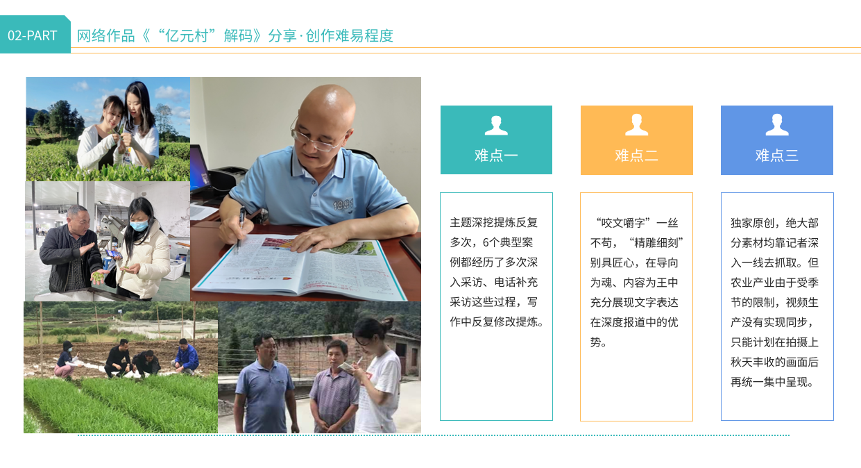 这组作品通过政策语言和文学语言的有机结合,在标题上画龙点睛,在正文中讲好故事,在图片上有机搭配,形成了有思想、有温度、有品质,是既连天线又接地气的深度独家原创报道。