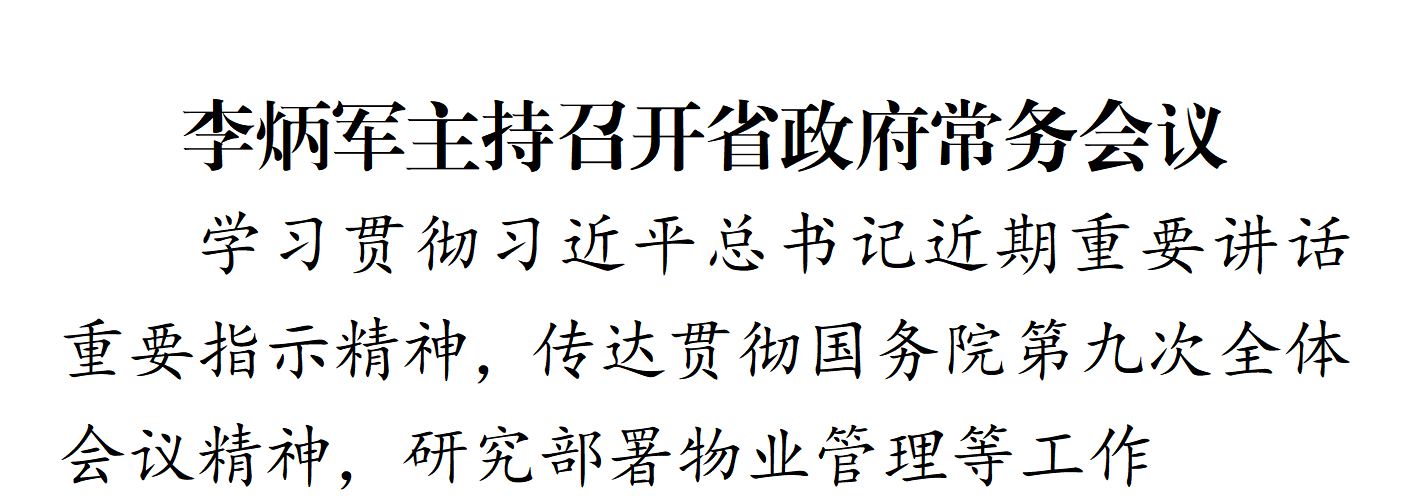 8月20日,省委副书记、省长李炳军主持召开省政府常务会议,学习贯彻习近平总书记近期重要讲话重要指示精神,传达贯彻国务院第九次全体会议精神,研究部署物业管理等工作。