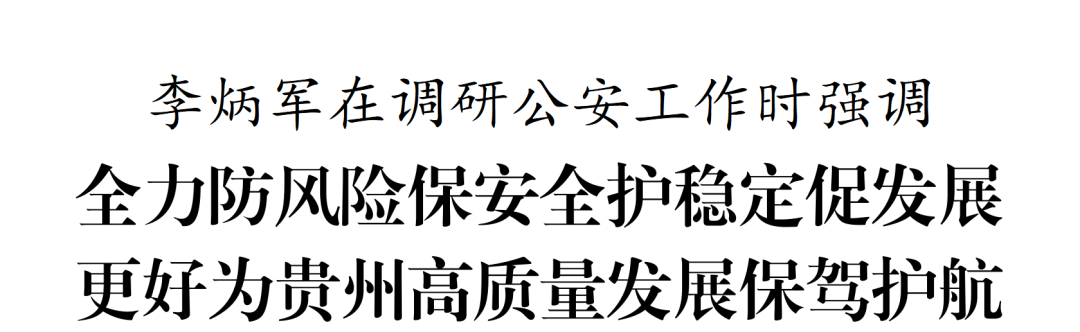 8月8日,省委副书记、省长李炳军在贵阳市调研公安工作。他强调,要深入学习贯彻习近平总书记关于新时代公安工作的重要论述和在贵州考察时的重要讲话精神,认真落实省委、省政府工作部署,全力做好防风险、保安全、护稳定、促发展各项工作,大力建设更高水平平安贵州,更好为推动贵州高质量发展保驾护航。副省长、省公安厅厅长贾利军参加。
