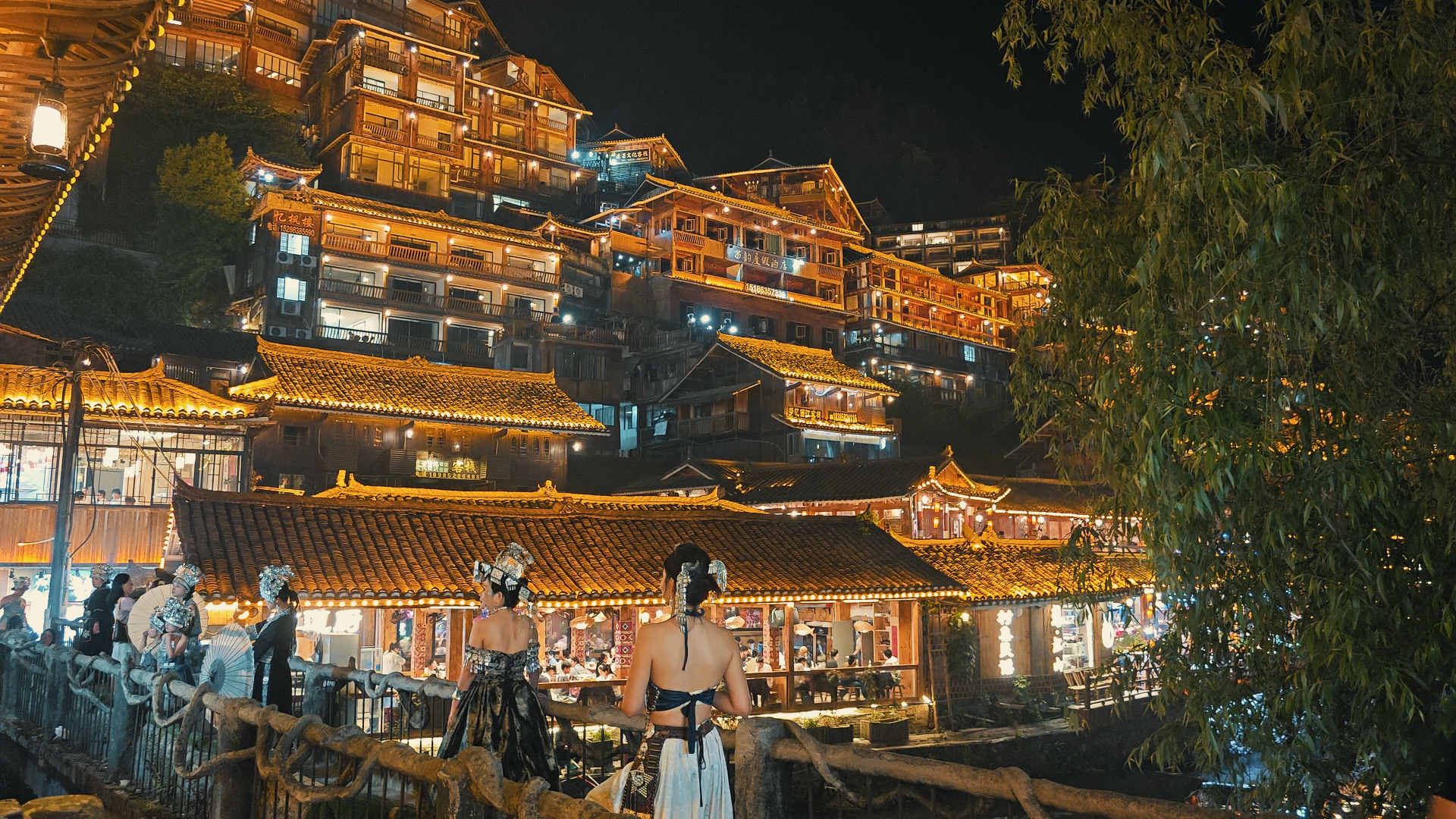 “我来自贵阳”“我来自沈阳”“我从上海过来”……景区内,说着不同口音的游客分享着各自的旅程。游客小李是苗寨的“回头客”,她带着孩子故地重游:“这里保留着最纯粹的苗族村落风貌,索道缆车对老人孩子很友好,酸汤鱼和黑毛猪烤串也很美味。”