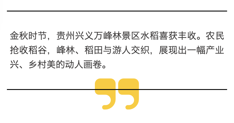 峰林环绕,稻浪滚滚,人欢机鸣。如今,万峰林的秋收图景,不仅是农业生产的生动现场,更成为了推动当地文旅融合、促进经济发展的亮丽名片。