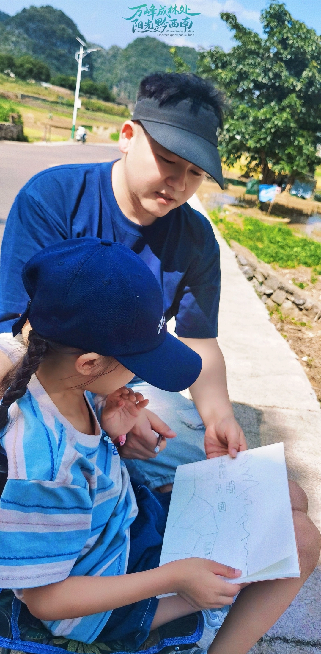 市民黄兵带着女儿在万峰林游玩。(图/杨雯)