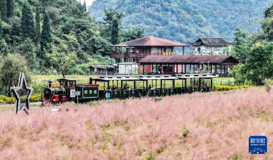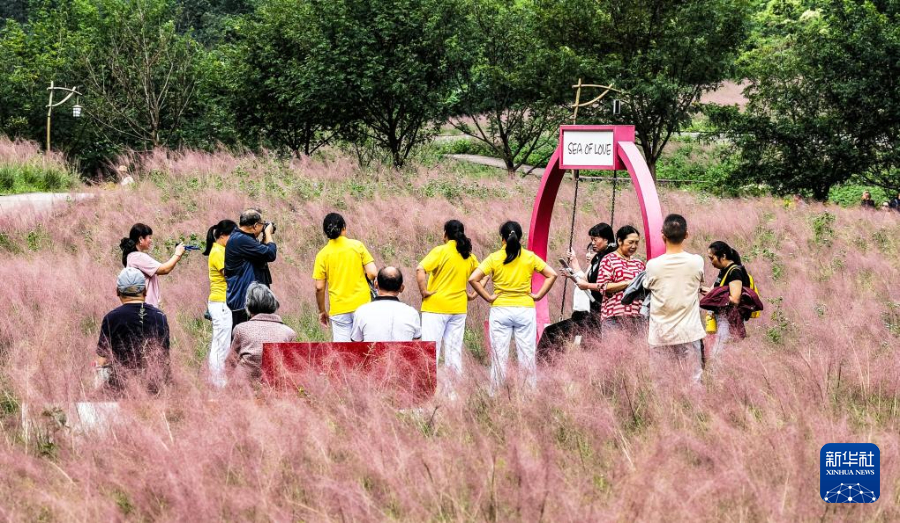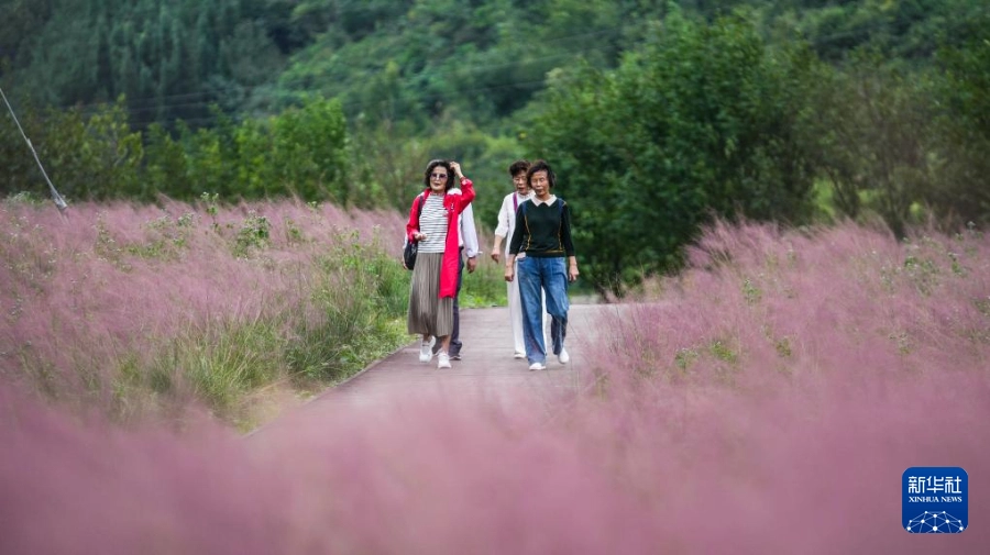 近日,贵州省黔南布依族苗族自治州长顺县神泉谷景区内的粉黛乱子草渐渐进入盛开期,成片的“粉色花海”吸引众多游客前来观赏游玩。