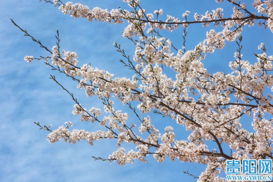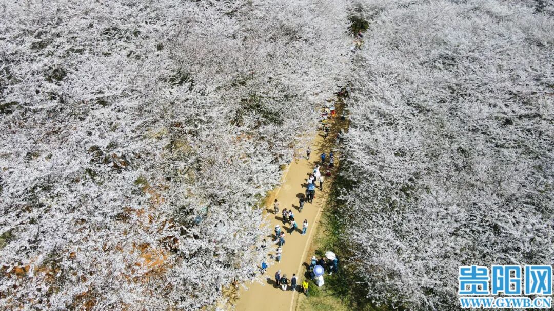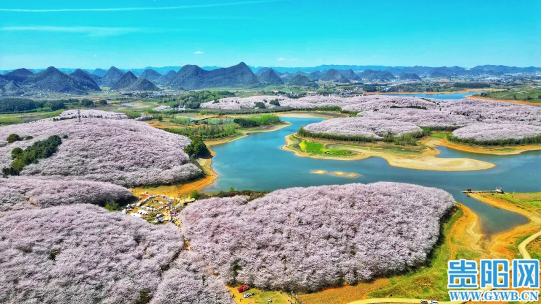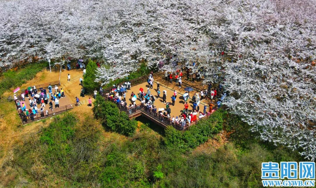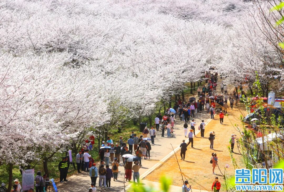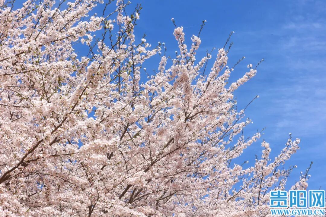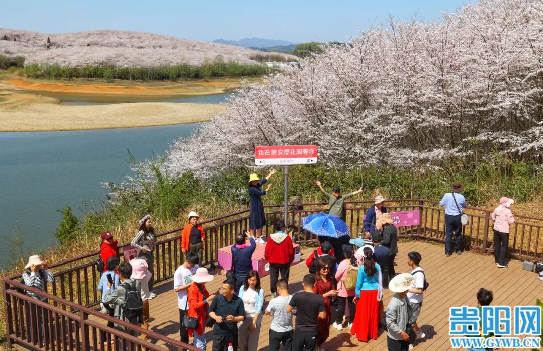 3月25日,贵安新区万亩樱花园樱花竞相绽放,吸引众多游客和市民前往观赏。