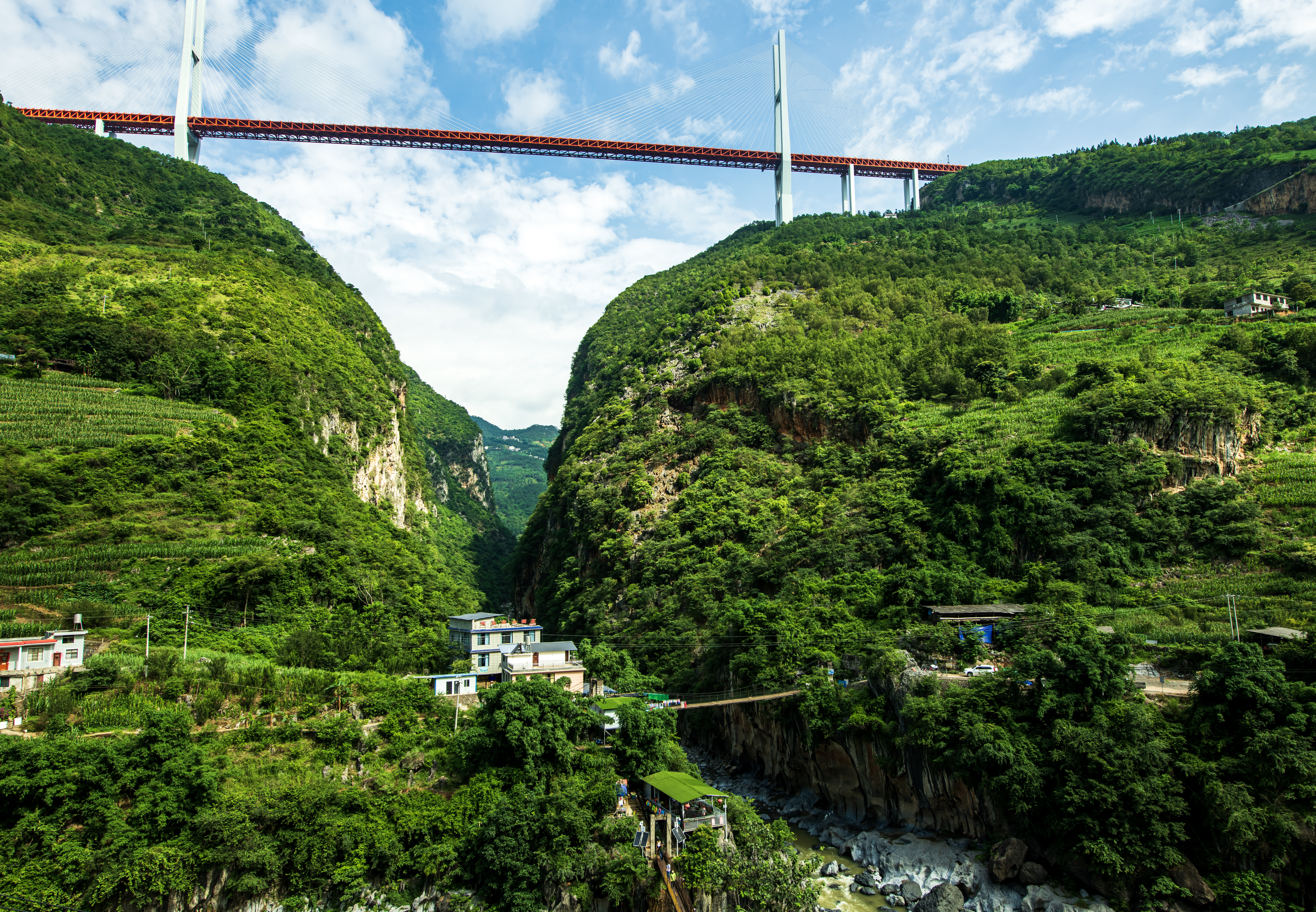 花江峡谷大桥:搭乘207米高的观光电梯,仅需1分钟即可登顶桥塔,在景观廊道、玻璃观光大厅可无遮挡地欣赏峡谷奇景。