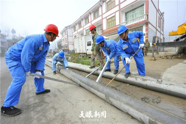 供电员工正在对改造台区所需的电杆进行搬运组立