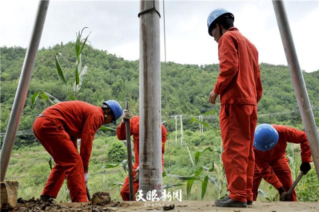 6月26日,在贵州省黔西南州望谟县蔗香镇,工作人员正在进行10千伏供电线路的挖坑、立杆、架线等工作。工程投运后,将进一步完善当地农村电网结构,解决农村生产生活用电的瓶颈问题。