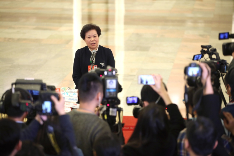 3月13日,十三届全国人大一次会议在北京人民大会堂举行第四次全体会议。这是中国气象局局长刘雅鸣在“部长通道”接受采访。金立旺 摄
