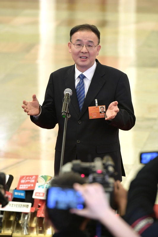 3月19日,十三届全国人大一次会议在北京人民大会堂举行第七次全体会议。这是国家邮政局局长马军胜在“部长通道”接受采访。刘金海 摄
