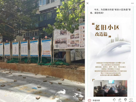 一是做好事前公开,改造需求精准问需。改造启动前,通过社区公告栏、多功能展示屏及微信公众号等渠道,向社区居民主动公开本年度老旧小区改造范围、内容、预算、施工时间等信息,让居民对改造事项“心里有底”。组织召开改造工作座谈会,邀请住建局、街道办事处、社区工作人员向居民集中讲解改造设计方案,针对关注问题进行重点答疑。通过公开意见征集邮箱、热线电话、发放《老旧小区改造意见征集表》调查问卷等方式,主动倾听居民诉求,共发放问卷1200份,累计收集道路交通系统优化、公共空间规划调整、市政管网改造等方面的意见建议236条,在此基础上优化完善老旧小区改造设计方案,确保改造方案符合民意、满足需求。