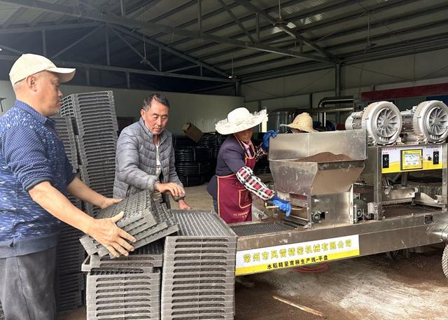4月24日,走进金沙县岩孔镇箐口村水稻育秧基地,金沙云山农民种植合作社最新引进的水稻钵苗精量育秧机轰鸣作响,工人正在精心地筛育苗土、整理苗盘,钵体育苗机自动往盘里添加肥料、种子、覆土,随后传送至育苗基地,整齐摆盘等待发芽。
