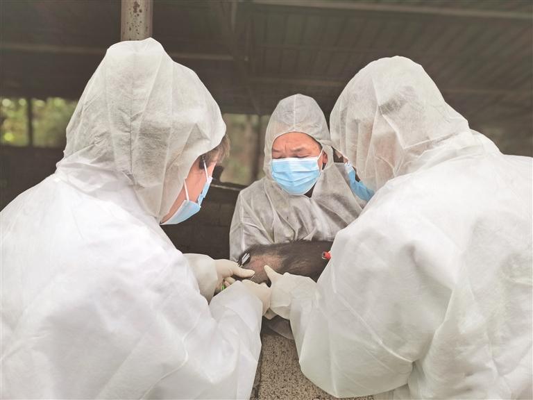科研人员检查江口萝卜猪生长情况。(省农业农村厅供图)