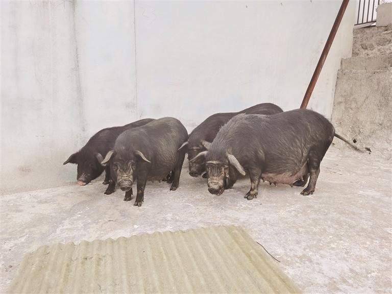 行进在萝卜猪踩出来的密林小道上,远远瞧见林间黑影耸动,正是在专注吃着竹笋的萝卜猪。“你们看,萝卜猪全身毛是光亮的黑色,耳朵有一点儿下垂,额头上还有两三条横行皱纹。它们四肢短小,个体小,吃得少,所以生长速度较慢,成年猪也就150斤左右。”杨再恩介绍,在饲养上,萝卜猪每天回圈后还要补一次青料,青料以野生采集为主,人工种植青料为辅,粗料以统糠为主,精料有碎米、红薯、马铃薯等。