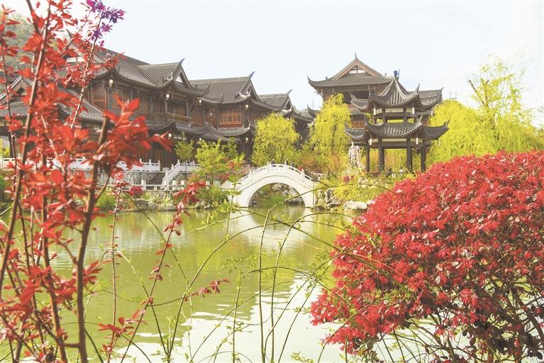 亭台楼阁错落有致,小桥流水交相辉映。在这里,不用逃离城市的喧嚣,便可以寻觅心中的一抹宁静。每天,都有来自各地的游客或漫步石板道,或游走湖岸边,享受织金古城避暑的悠然乐趣。