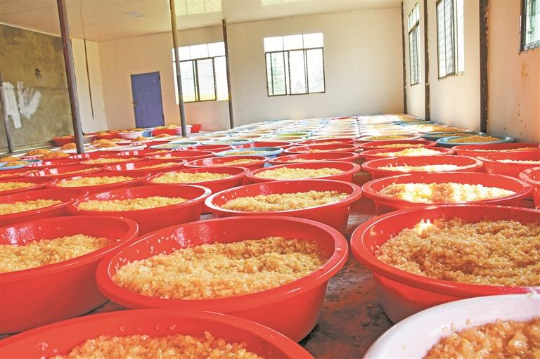 走进位于织金县猫场镇的贵州美滋堂食品销售有限公司,20多名工人正在熟练地加工皂角籽。这里每天加工的皂角籽不少于1.5吨。织金县皂角产业商会会长、美滋堂公司负责人谢伟介绍,从皂角籽中剥出完整的皂角精是一项精细活,目前还没有能代替人工的机器,全县每年加工皂角精,可带动6120户2.5万余名群众增收6000多万元。