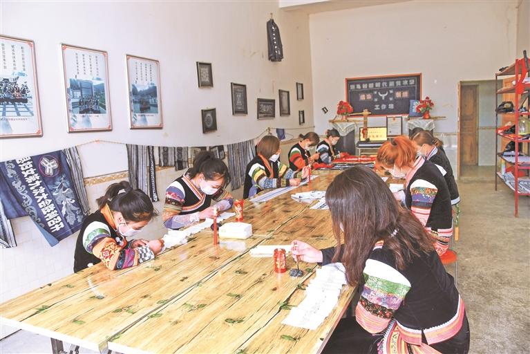 绣娘在织金县茶店乡海马村蜡染刺绣专业合作社开展刺绣工作。 张云航 摄