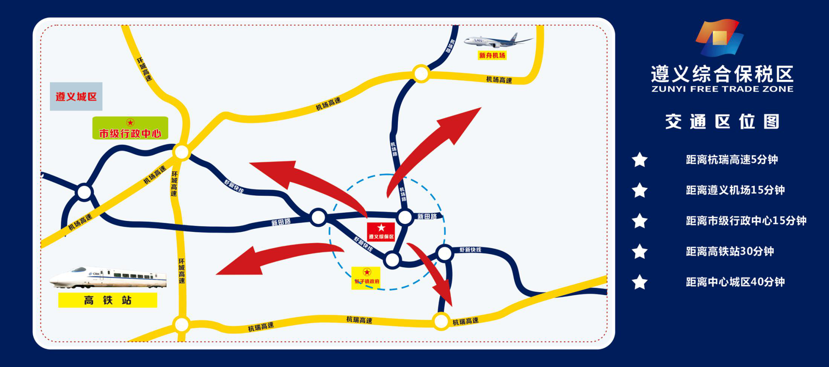 遵义综合保税区临近有遵义医科大学第二附属医院、新蒲新区人民医院等三甲医院或综合医院。拥有遵义第四中学、北京师范大学遵义附属学校、经开区中学、遵义文化小学等优质教育资源,可解决子女就近入学。人才公寓、超市、电影院、购物街、美食街等配套齐全。园区形成10分钟达杭瑞和兰海高速公路,15分钟达遵义新舟机场,15分钟达市级行政中心,30分钟达遵义高铁站,40分钟达乌江航道的立体综合交通体系。遵义新舟机场直达国际国内50余个城市,已跨入中型机场行列,正式货运口岸获批建设,从黔渝高铁可40分钟到贵阳、80分钟到重庆、5小时到广州。