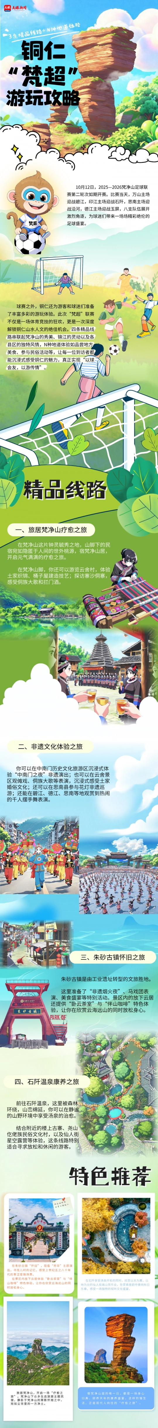 球赛之外,铜仁还为游客和球迷们准备了丰富多彩的游玩体验。此次“梵超”联赛不仅是一场体育竞技的狂欢,更是一次深度解锁铜仁山水人文的绝佳机会。四条精品线路串联起梵净山的秀美、锦江的灵动以及各县区的独特风情,N种地道体验如品尝地方美食、参与民俗活动等,让每一位到访者都能沉浸式感受铜仁的魅力,真正实现“以球会友,以游传情”。
