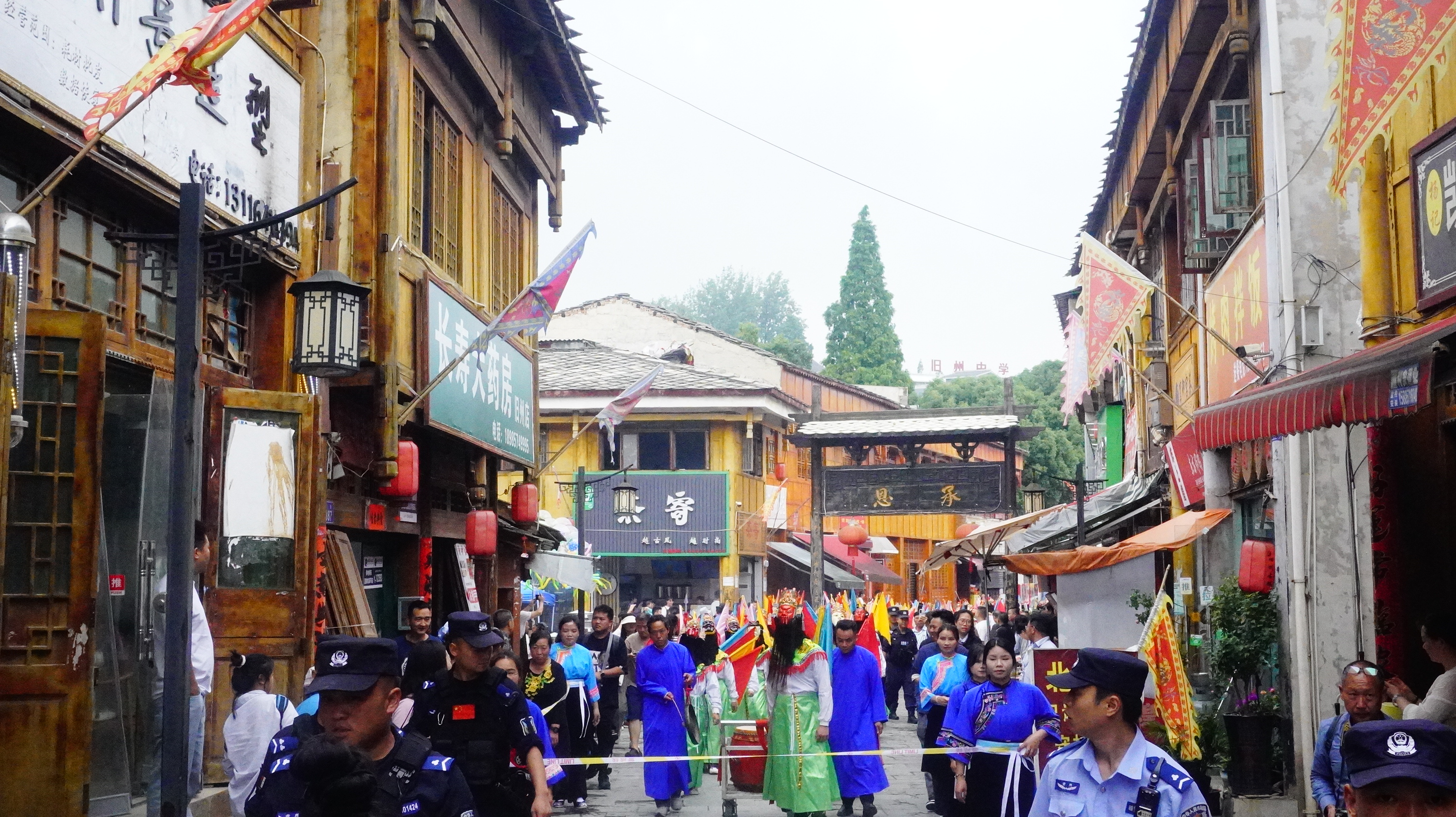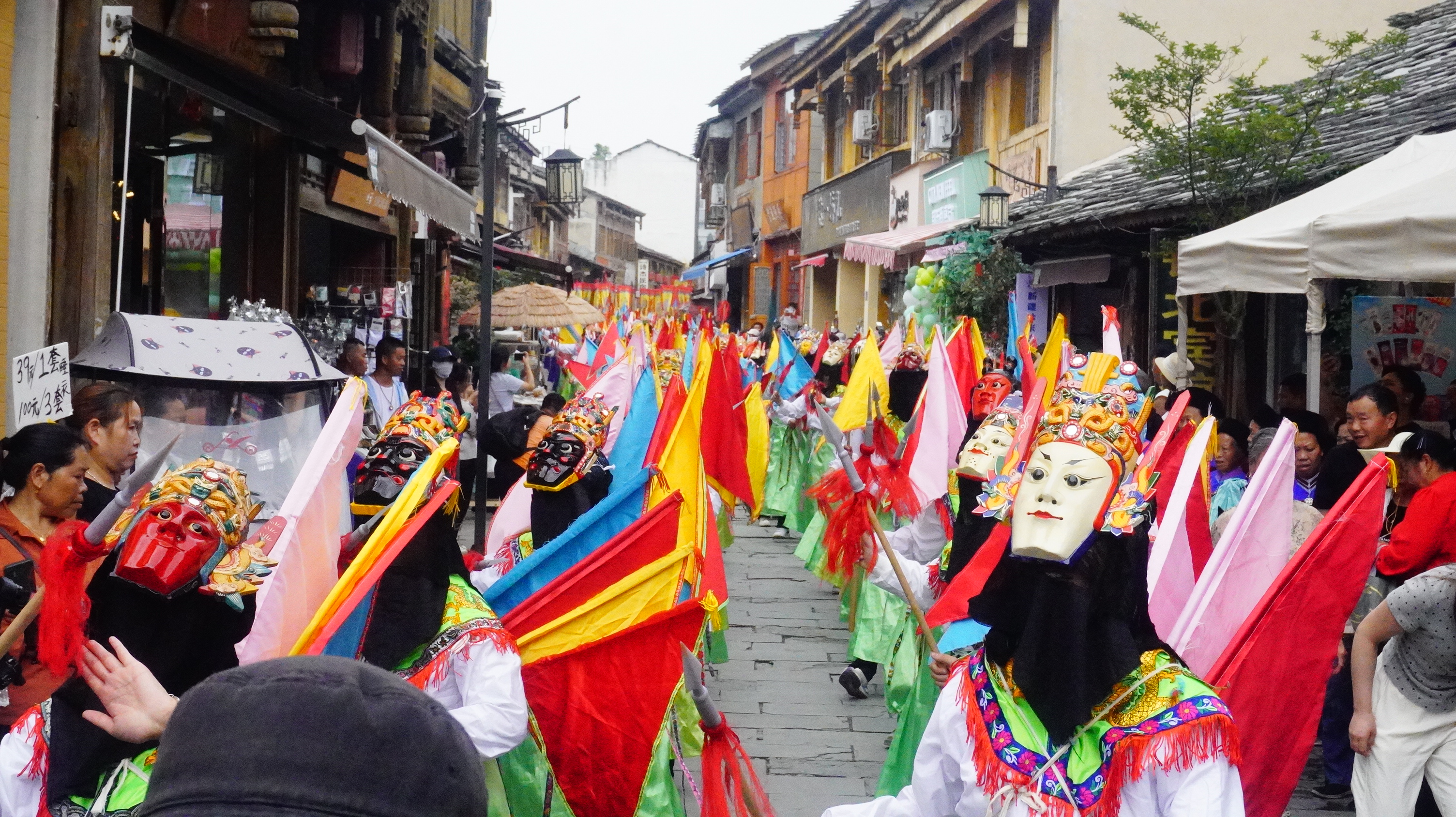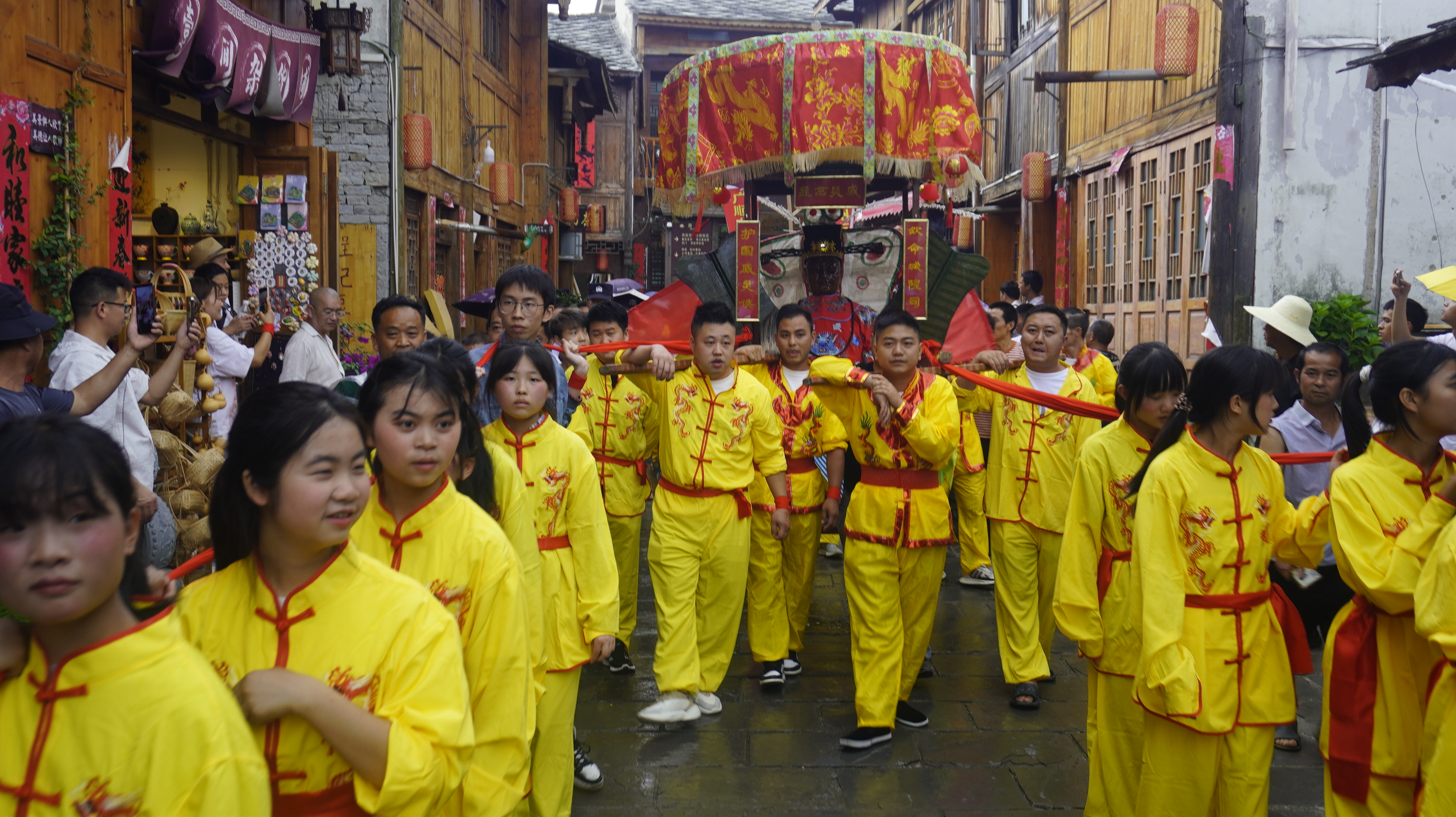 当天下午,随着喧腾的锣鼓声响起,浩浩荡荡的抬城隍巡游队伍穿梭于旧州古镇的街巷之间。同时,传统表演轮番上阵,共同展示出一幅生动绚丽的民俗画卷。