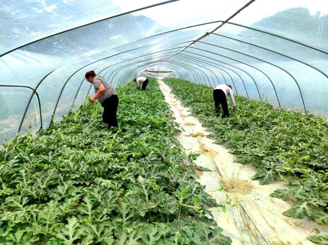 在位于后庄村水芽组的西瓜种植基地里,西瓜大棚内一片绿意盎然,茂密的瓜藤下,一个个圆润饱满的西瓜正在茁壮成长。村民们正忙着打西瓜植株的侧枝。