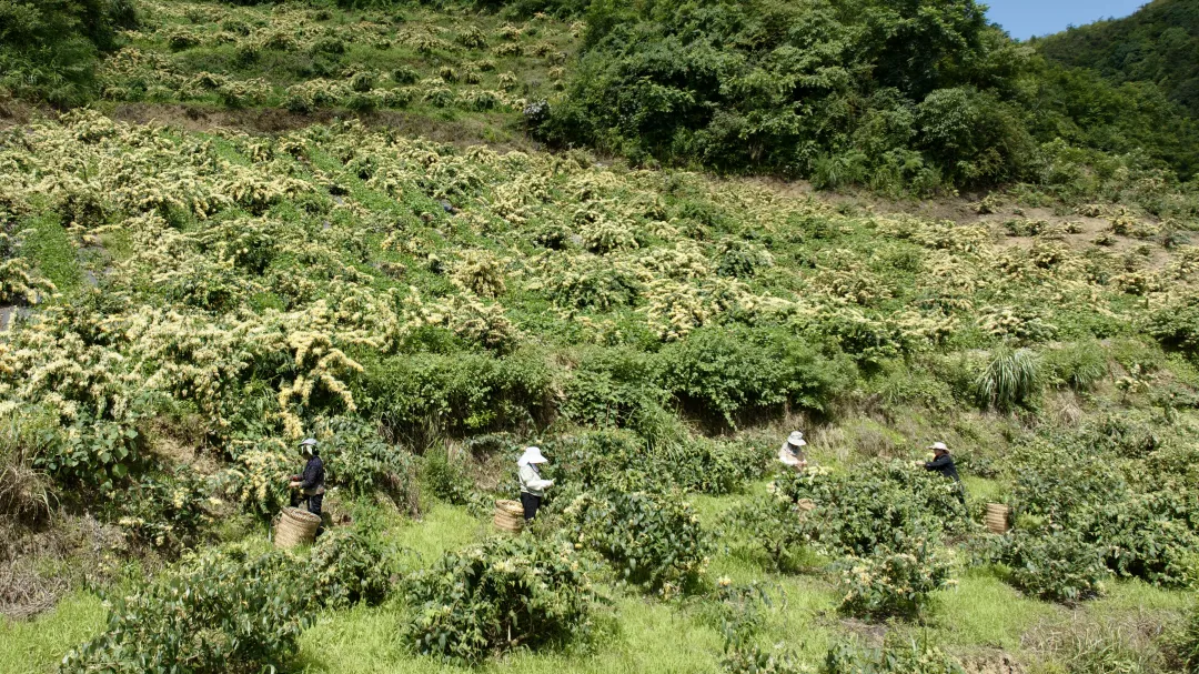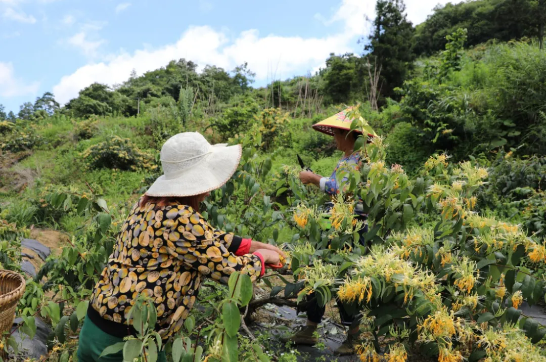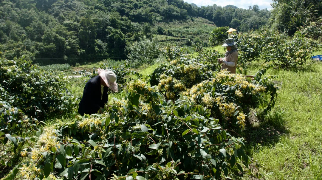 盛夏七月,绥阳县小关乡连绵起伏的翠绿山峦间,7.3万亩山银花迎来了盛花期尾声,也进入了一年中最火热的采摘与加工季。漫山遍野,银白与淡黄交织的花浪随风起伏,馥郁的芬芳弥漫在温热的空气中。
