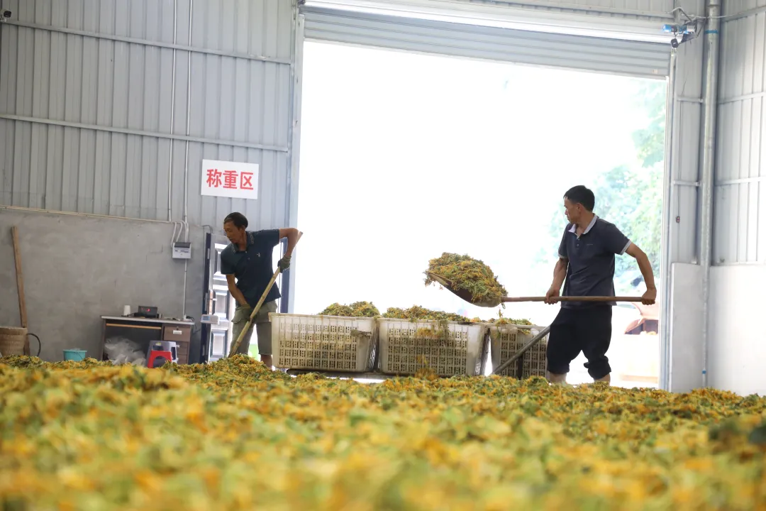 花事尾声,仓廪渐丰。山间采摘的繁忙景象,无缝衔接至山下的贵州黔茂农业开发有限公司。步入厂区,一股更为浓郁、带着烘焙气息的花香扑面而来。生产车间内机器轰鸣,巨大的滚筒烘干设备匀速转动,将新鲜的山银花转化为便于储存运输的干花。工人们在流水线旁紧张有序地忙碌着,分拣、摊晾、打包……空气中蒸腾着花的热气与劳动的炽热。