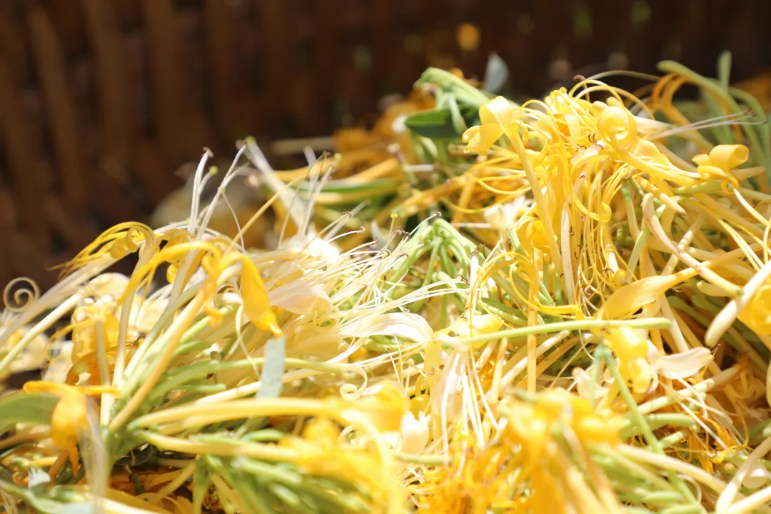 在金色的阳光下,十余名头戴草帽、臂挽竹篓的采摘工人,正俯身于茂密的花丛间,手指如飞。只听“簌簌”轻响,饱满圆润、沾着晨露的花苞便精准地落入篓中,不一会儿,篓底便铺上了一层厚厚的“金银”。