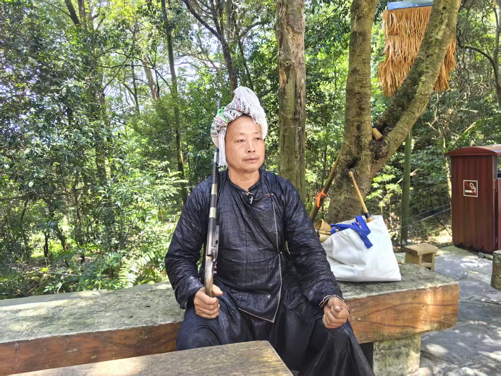 尽管身居管理岗位,滚水格有空的时候仍坚持亲自讲解。“游客问‘树葬’的意义、苗刀的作用,我必须答得准确。”他常走访寨老,记录口述历史,学习专业知识,“讲解员代表岜沙的形象,文化绝不能讲错。”