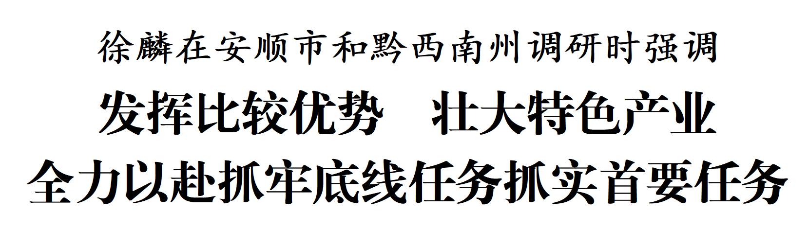 11月18日至19日,省委书记、省人大常委会主任徐麟深入安顺市紫云自治县,黔西南自治州贞丰县、兴仁市调研。他强调,要结合开展主题教育,深入学习贯彻习近平总书记视察贵州重要讲话精神和对贵州工作重要指示精神,坚定不移围绕“四新”主攻“四化”,发挥比较优势,壮大特色产业,全力以赴抓牢抓实巩固拓展脱贫攻坚成果底线任务和高质量发展首要任务,为推进中国式现代化的贵州实践作出更大贡献。省委常委、省委组织部部长时玉宝,省委常委、省委秘书长陈少波参加。