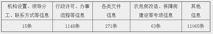 三是加强平台建设。在厅门户网站开设了信息公开专栏,主动公开厅领导分工、机构设置、主要职责等信息;开通了厅政务微博,及时发布相关信息,回应社会关切;在厅五楼政务服务中心办证大厅、十三楼住房资金管理中心、十八楼省建设工程造价管理总站分别设置三个现场查阅点。