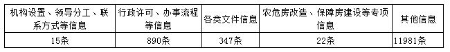厅门户政府网站全面公开了领导介绍、机构设计及职责、政策法规、房地产市场监管、住房保障、住房公积金监管、城乡规划、城市建设、建筑业管理、节能科标、村镇建设、计划财务等,并主动公开了重点领域信息。