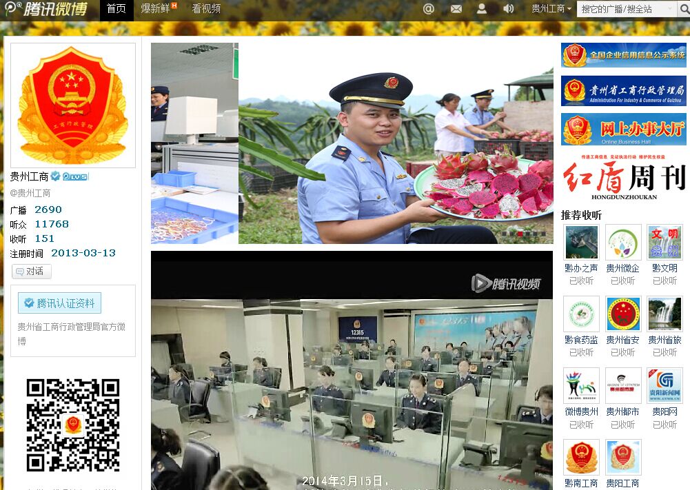 (二)是利用新媒体发布信息。我局先后开通了 “贵州工商”官方微博、微信,率先在贵州省直机关开启“双微互动时代”。2014年,我局官方微博累计发布信息2116条,日均发布3.3条次每天;发布商事制度改革、注册资本改革、企业信息公示暂行条例等工商重要改革资讯213条,增设国内要闻、省内要闻及工商要闻等3个话题,及时传递各类大事要事,丰富贵州工商官方微博发布内容;及时有效处理各类重要咨询和网络舆情236条;30多条微博信息被省政府办公厅官方微博“黔办之声”转载或评论,“贵州工商”官方微博受关注度和知晓度持续增加,服务群众的职能日益显现,多次受到网友好评。5月28日,贵州工商官方微信(注册ID:gzsaic;注册名称:贵州工商)正式上线运行。该微信设置了“工商动态”、“工商服务”、“工商互动”3个栏目和“信用查询”、“直通交流台”等13个服务项目,实现了手机端查询全国企业信用信息、工商业务在线咨询、工商办事指南在线观看的目标。截至目前,贵州工商官方微信累计关注人数2459人,累计推送微信信息27期216篇,收到用户有效提问137条、互动消息128人次,累计回复互动消息200余次。“贵州工商”官方微博被腾讯公司两次表彰为“2013年度、2014年度贵州省十大政务微博”,“贵州工商”官方微信被腾讯政务服务微信公众账号首次推荐为西南地区最值得关注的政务微信之一。2014年11月,我局在全省政务微信建设现场推进会上作经验交流发言。2014年12月31日,省互联网信息办公室发布全省政务微信影响力首期排行榜名单,“贵州工商”官方微信位居全省700多个政务微信公众账号第9名,荣获“2014年政务微信建设卓越奖”。