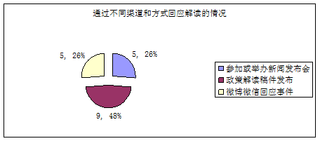 通过不同渠道和方式回应解读19件,其中,参加或举办新闻发布会5次(主要负责同志参加新闻发布会1次),政策解读稿件发布数9篇,微博微信回应事件数5次。