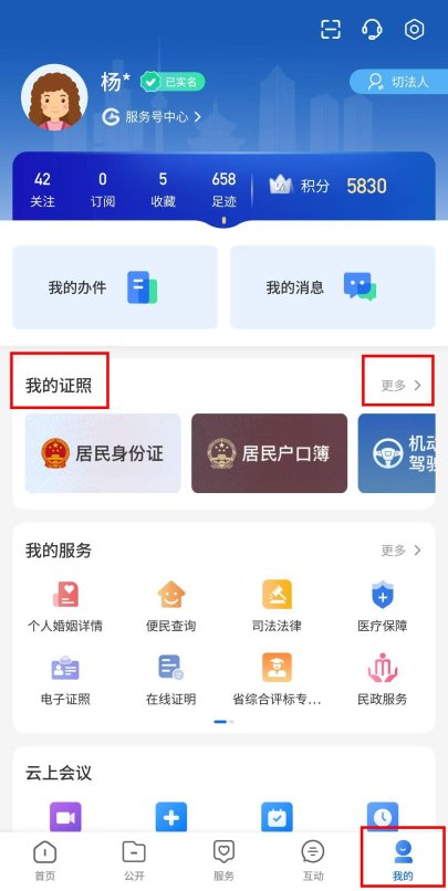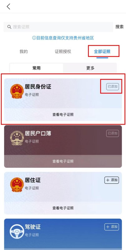 首先,登录“中国·贵州”移动端或者微信小程序,在页面地步点击“我的”板块,在“我的证照”专栏点击“更多”进入页面;