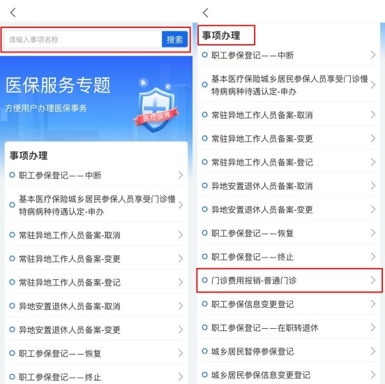 第三步:搜索或在“事项办理”区域找到“门诊费用报销-普通门诊”;