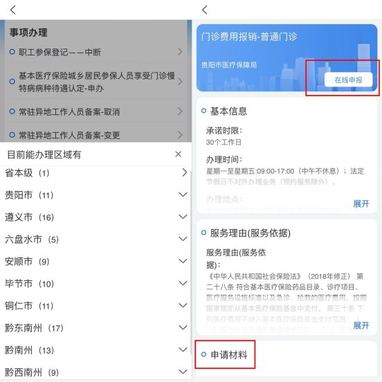 第四步:选择医保参保所在地,查看申报“基本信息”“申请材料”“办理流程”等信息,按申报要求准备好“申请材料”后,点击“在线申报”;