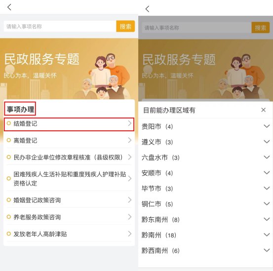 第三步:在“事项办理”栏选择“结婚登记”服务功能,选择所需办理区域;