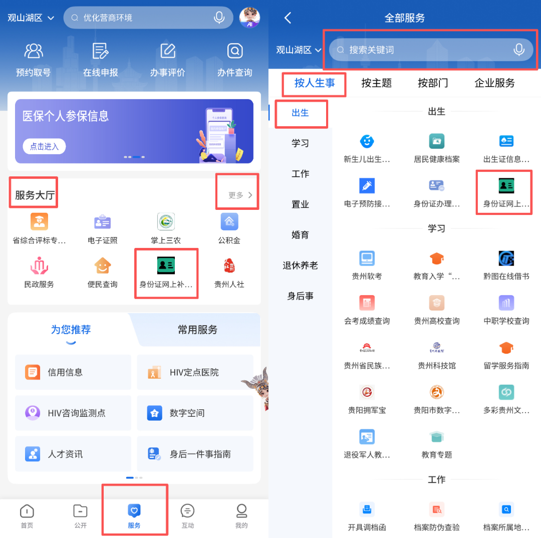 在“服务大厅”栏选择“身份证网上补换领”服务或点击“更多”,在页面上方搜索栏输入“身份证网上补换领”服务或“按人生事”在“出生”栏,找到“身份证网上补换领”服务进入页面。