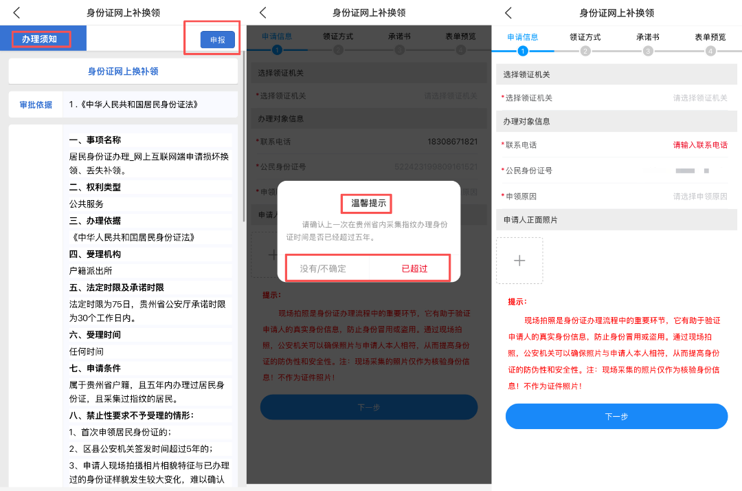注册或登录“贵州公安”账号进入申请页面,阅读弹框“温馨提示”并根据个人实际情况确认个人信息,根据页面提示填写申请信息,选择领证方式,签署有关承诺书,查看申报表单确认无误后提交即可完成线上申报。