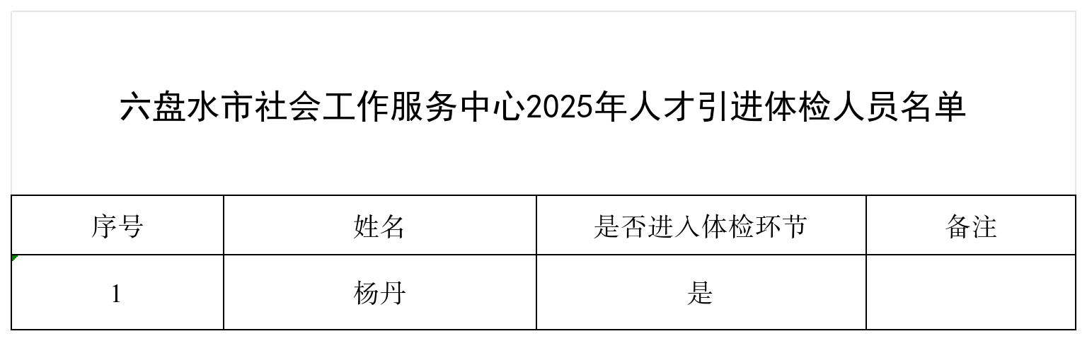 进入体检环节人员详见《六盘水市社会工作服务中心2025年人才引进体检人员名单》。请进入体检环节的应聘人员持本人有效居民身份证原件于体检当日上午8:30前到市委社会工作部1201办公室集中(六盘水市钟山西路50号)。