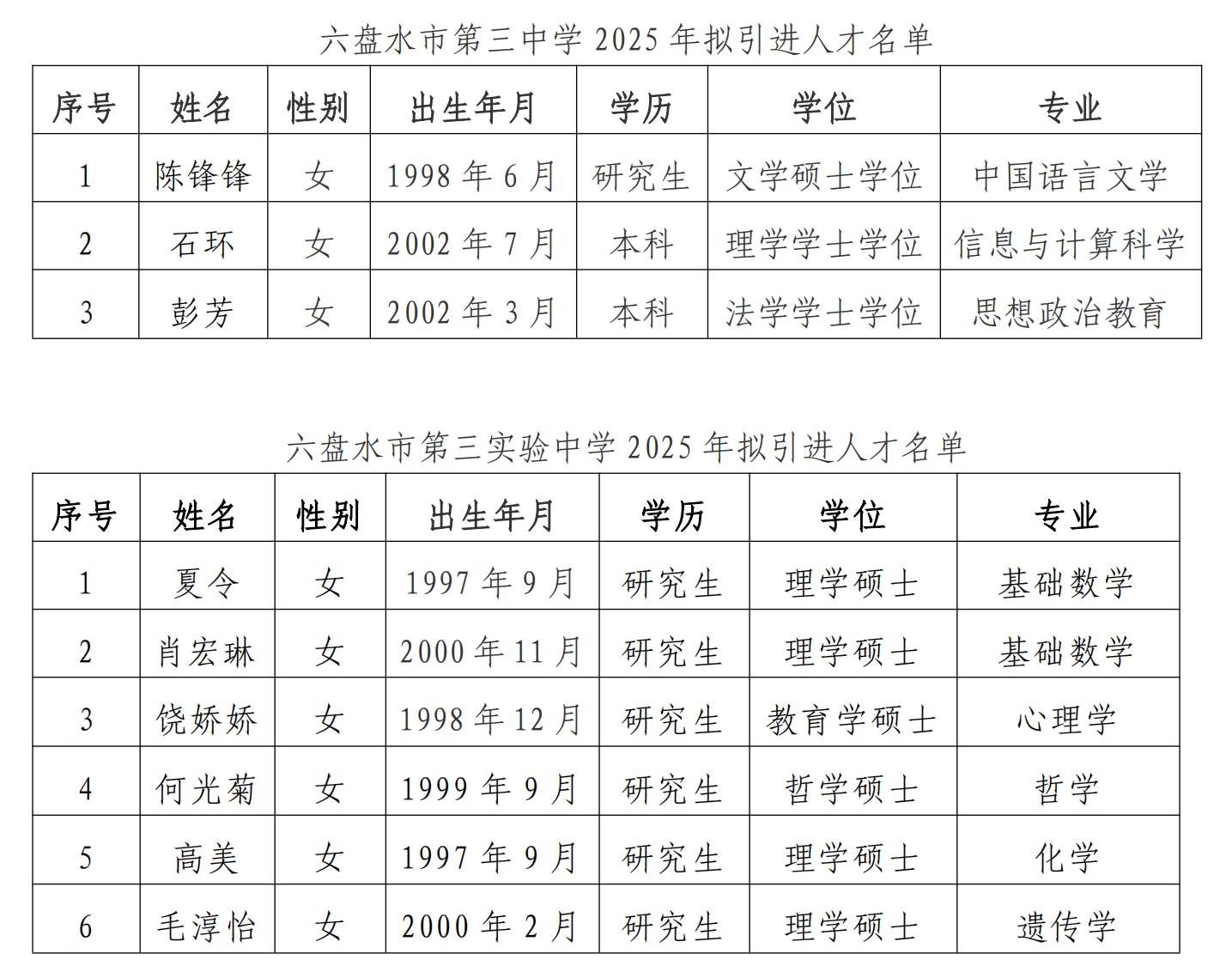 六盘水市第三中学、六盘水市第三实验中学2025年引进人才线上、线下、体检、考察等考核环节已完成,根据《六盘水市高层次人才引进办法》《六盘水市参加第十三届贵州人才博览会工作方案》《六盘水市参加第十三届贵州人才博览会2025年事业单位人才引进公告》规定,经六盘水市第三中学党委会议研究,现将拟引进人员名单公示如下。