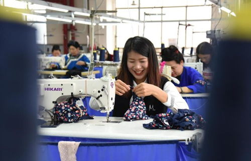 榕江县工业园区内一服装加工企业生产车间。