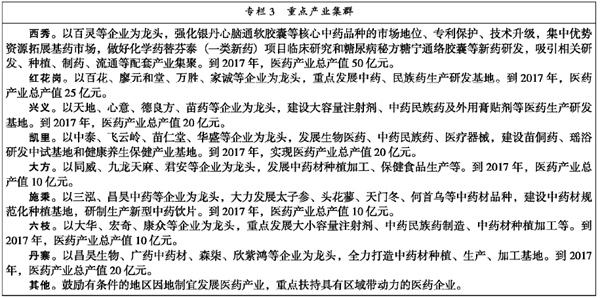 鼓励西秀、红花岗、兴义、凯里、大方、施秉、六枝、丹寨等有条件的地区因地制宜地发展医药产业,引导形成一批具有区域辐射效应的医药产业集群。