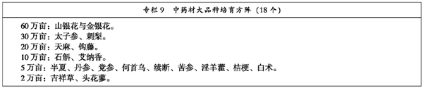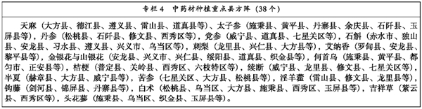 ——中药材大品种培育方阵。抓中药材种植品种,将中药材种植与扶贫相结合,结合品种生长适应性和新医药产业原料需求,重点发展山银花与金银花、天麻、太子参、刺梨等18个道地特色中药材大品种,打造规范种植及良种繁育基地,实现万亩连片、规模发展,加快建设医药物流园区、产地市场,促进药材资源就地转化。