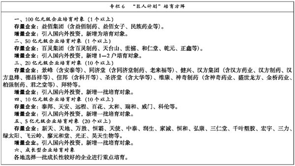 实施“巨人计划”,引进和培育一批有竞争力的大型企业集团。到2017年,整合形成50—80户优强企业,益佰率先打造为100亿元级医药大集团,百灵打造为50亿元级医药集团,形成20亿元级、10亿元级医药企业各10个以上,全省排名前20位的制药企业总产值比重提高到70%。