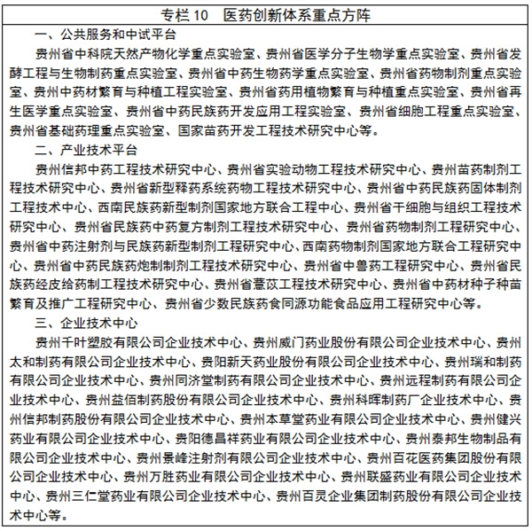 (十三)增强创新能力。发挥贵州大学、贵阳医学院、贵阳中医学院、遵义医学院、中科院天然产物重点实验室等省内外科研资源优势,推动产学研合作,建设省级公共技术和中试平台,支持综合性创新药物和单元技术研发,重点建设人体干细胞、中药、民族药、药用植物、动物、微生物及矿物等资源库。发挥企业技术创新主体作用,新增一批医药科技创新中心、企业技术中心,开展原始创新、集成创新和引进消化吸收再创新。创新医药研发模式,鼓励开展合同研发,推动相关企业在药物设计、新药筛选、安全评价、临床试验及工艺研究等方面开展研发外包服务。建立和完善医药创新服务体系,积极支持开展新药初步安全性评价及临床研究。力争“国家苗药开发工程技术研究中心”尽快落户我省。(牵头单位:省科技厅;责任单位:省教育厅、省食品药品监管局,各市〔州〕政府、贵安新区管委会)